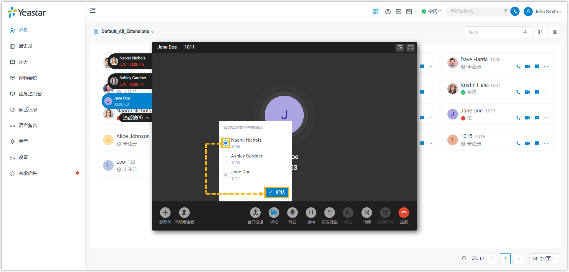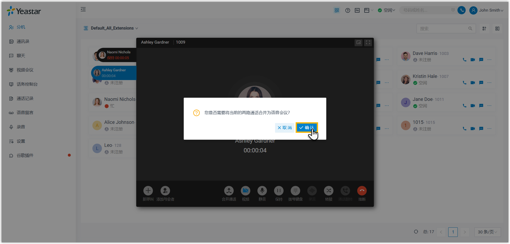 - 如果有多路通话,选择需要合并的通话,然后点击 确认。