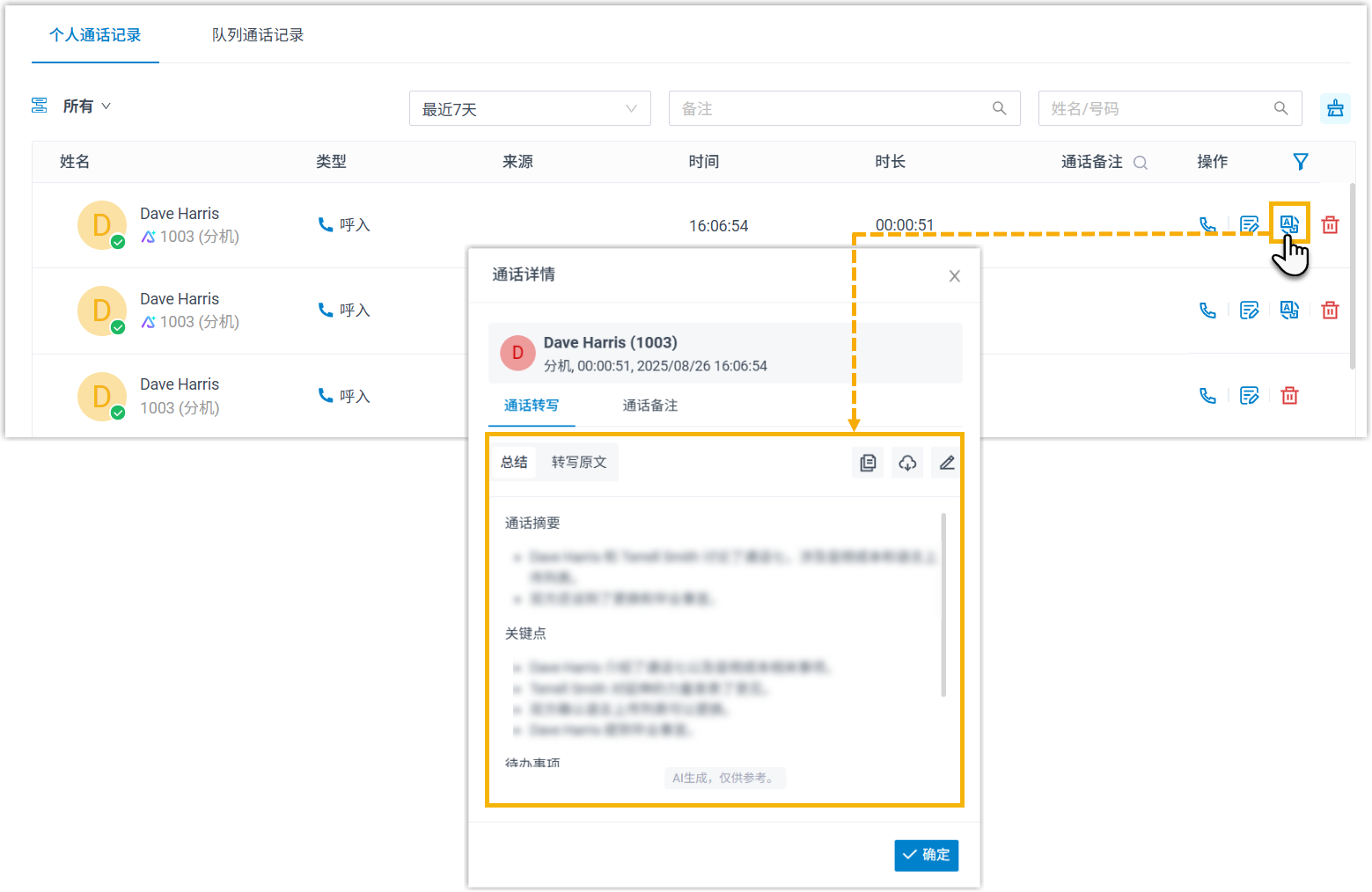 系统管理员已启用 通话转写 功能,并授予你的分机使用该功能的权限。