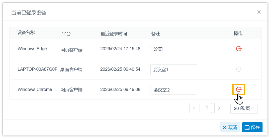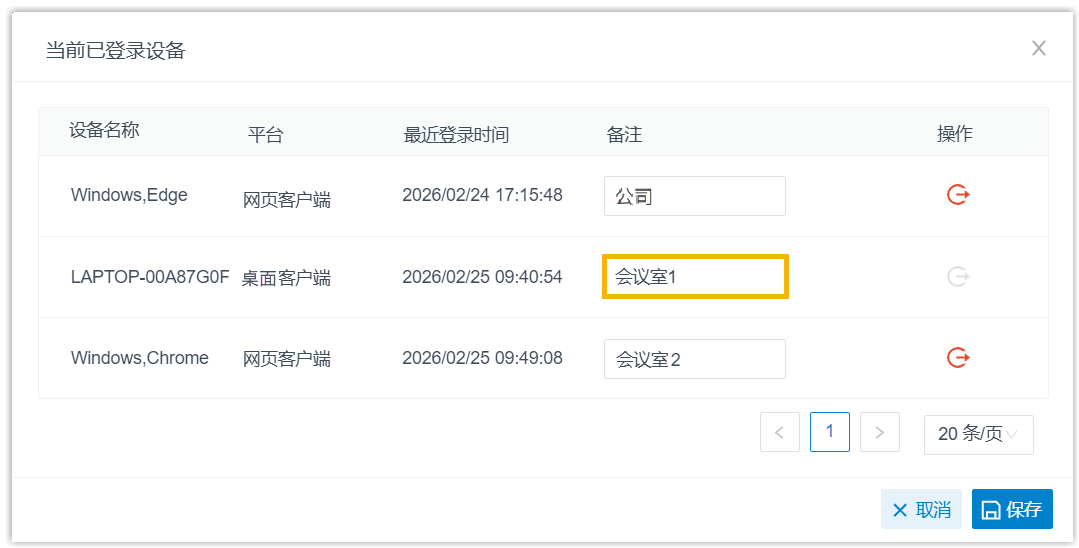 你可以在 Linkus 桌面端查看登录分机的所有 Linkus 客户端及其相关的设备信息 (设备名称、客户端类型及最后登录时间)。此外,你还可以为设备添加备注,或将分机从指定设备上登出。