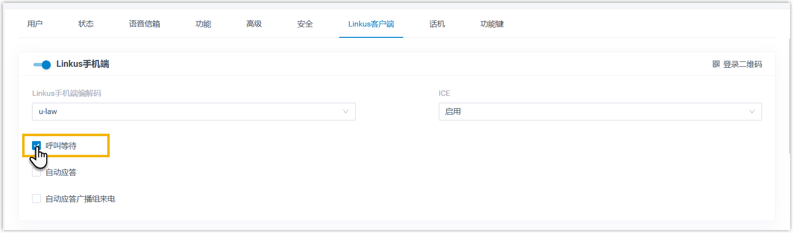 Linkus客户端 页签。 - 为所需的 Linku UC 客户端启用或禁用 呼叫等待。