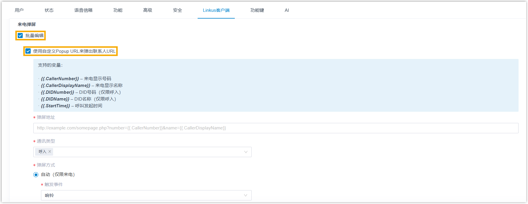 根据以下说明,批量为分机的 Linkus 桌面端和网页端设置来电弹屏。你也可以为单个分机自定义来电弹屏。