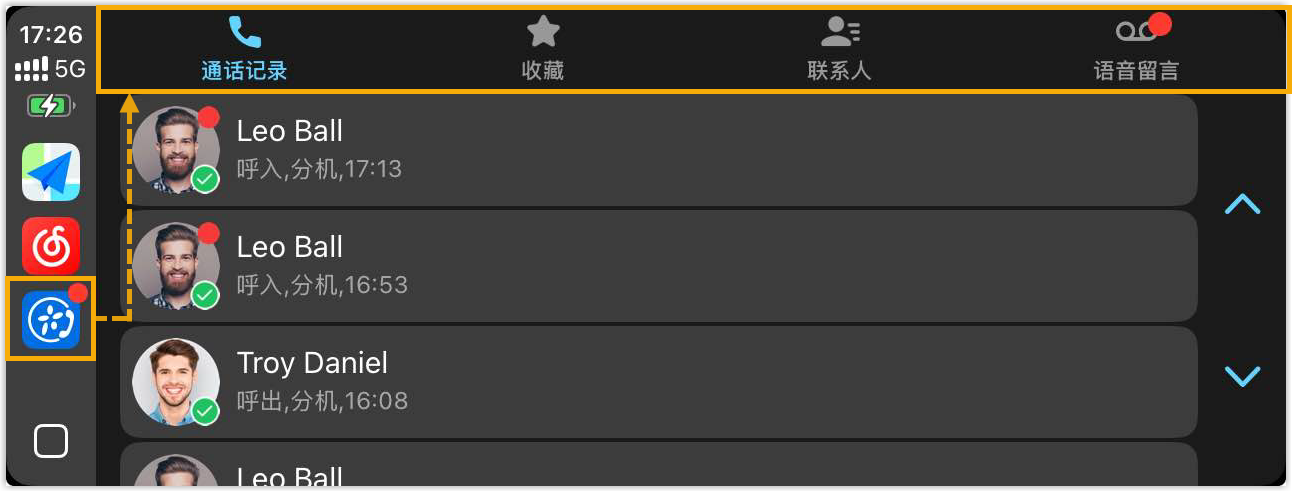 连接 Linkus 和 Apple CarPlay 车载系统后,你可以在驾驶时保持与同事和客户的沟通。通过 Siri 或车载界面轻松拨打和接听电话,并可直接在车载屏幕上查看语音留言,无需操作手机。