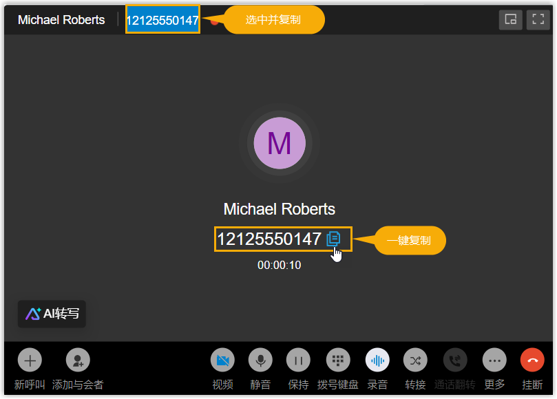 - 优化通话体验:通话过程中,通话窗口会显示其他通话方的号码,且支持通过以下任一方式便捷复制号码: