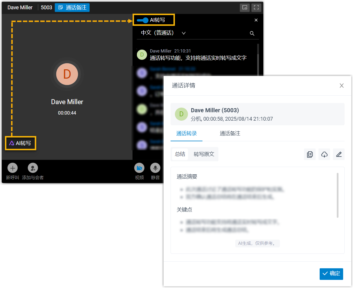 新增基于 AI 的通话转写功能,可将通话内容实时转写成可读文本,并在通话结束后生成通话总结。