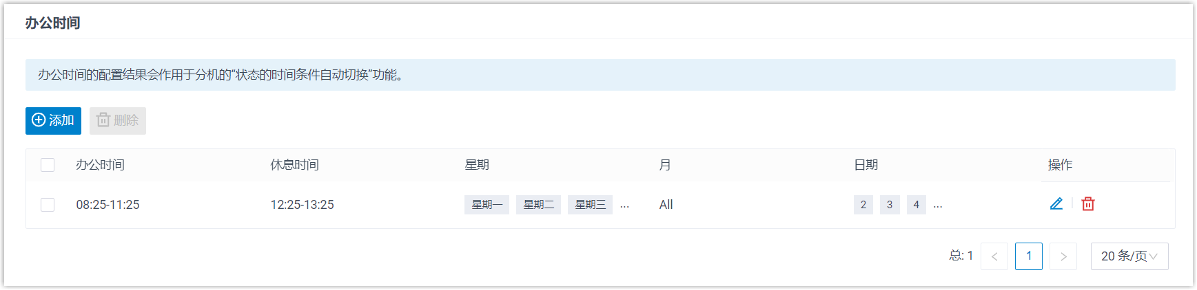 - 支持修改分机的自定义工作时间 (路径:),此自定义工作时间仅在分机根据办公时间和假期自动切换状态时生效。注: 此设置仅在系统管理员为你的分机配置了自定义工作时间时出现。