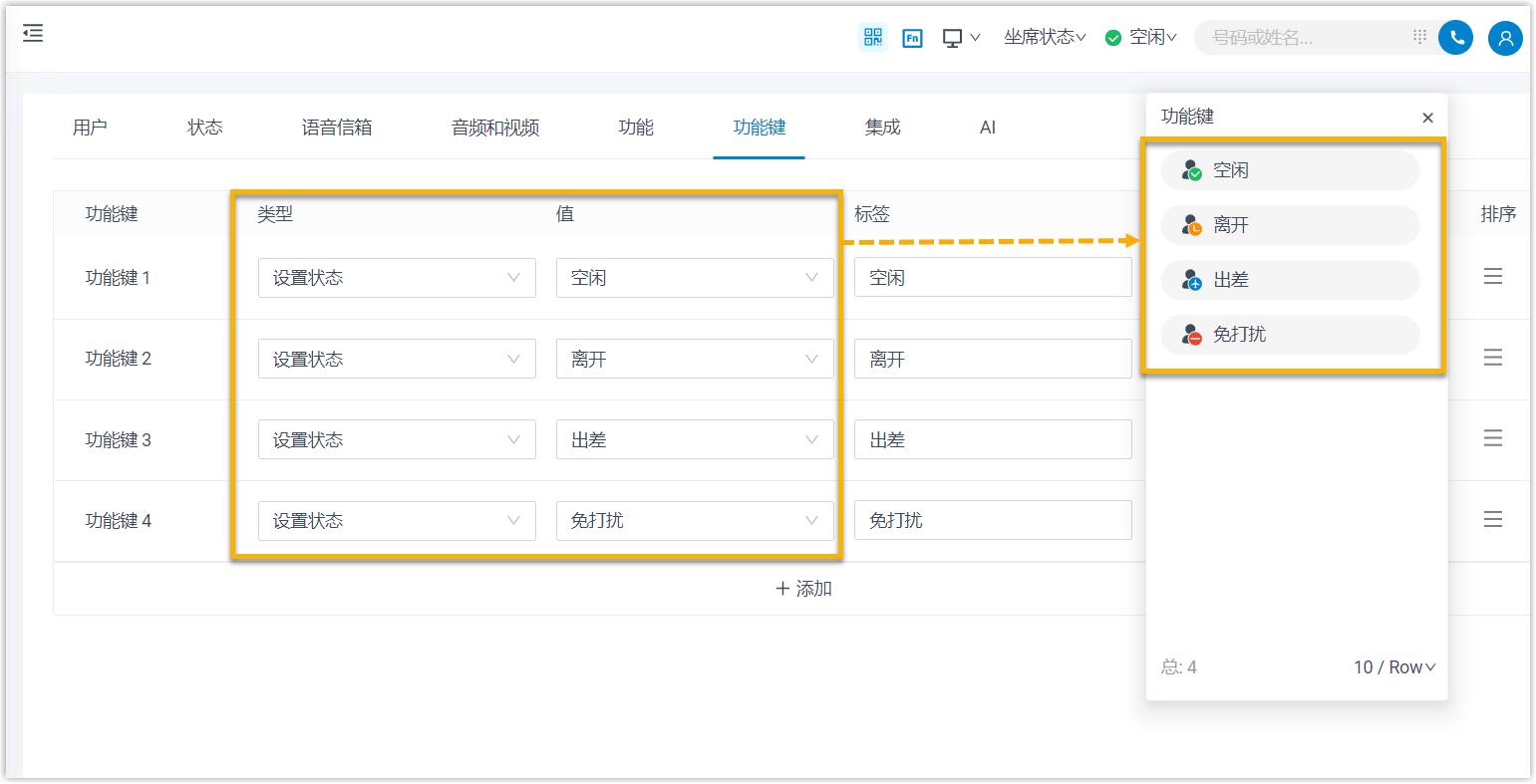 优化 功能键 功能 (路径:):新增功能键类型 设置状态,可快速将分机切换至指定状态。