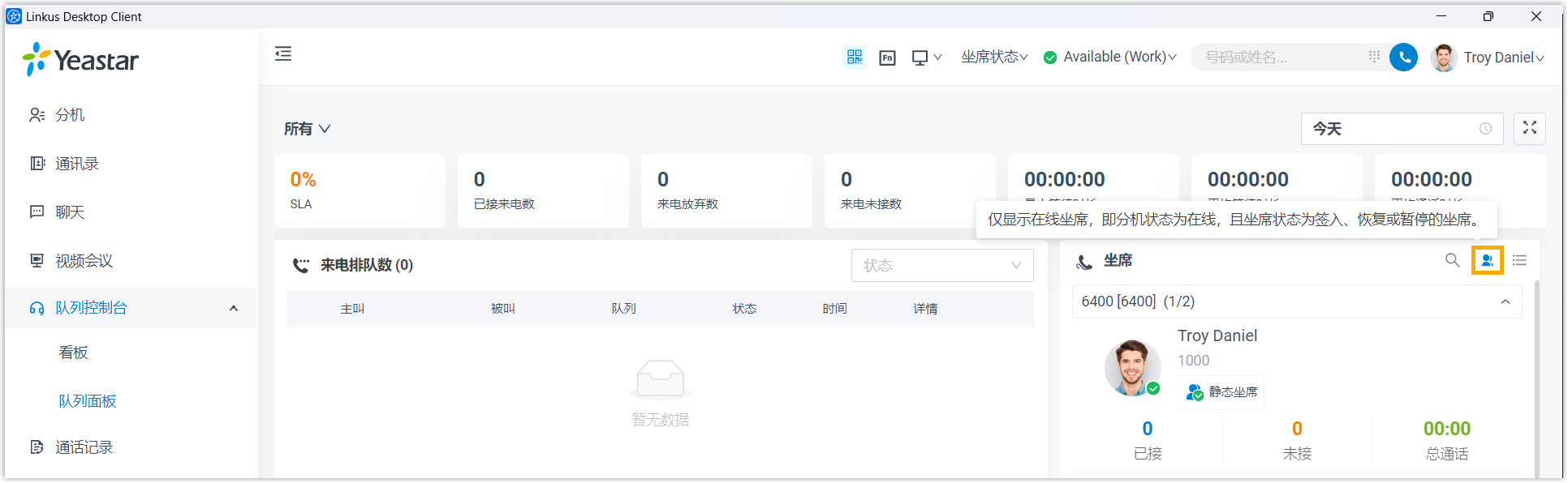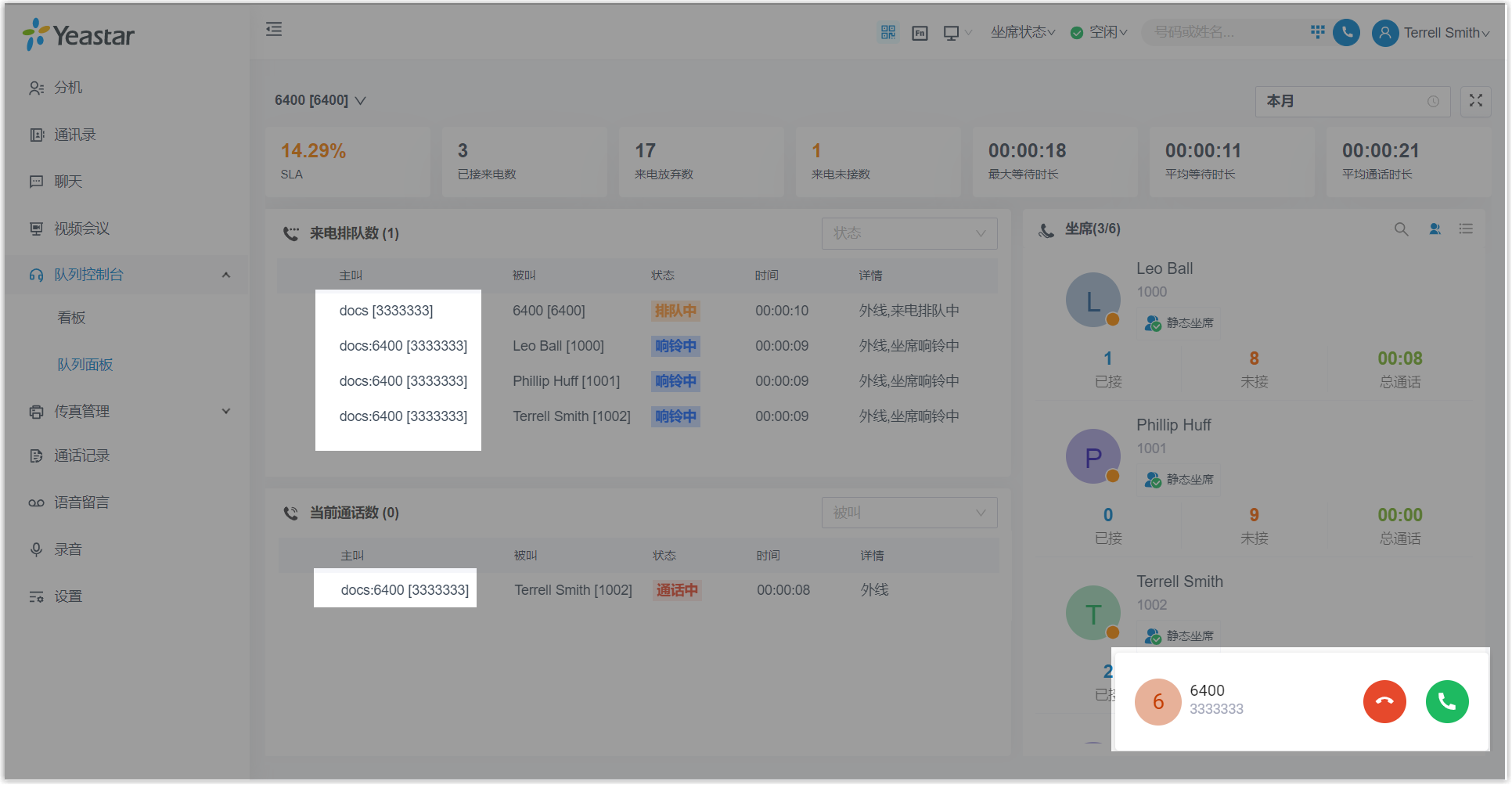 - 队列面板:允许呼入队列的坐席查看通话数据和处理队列通话。