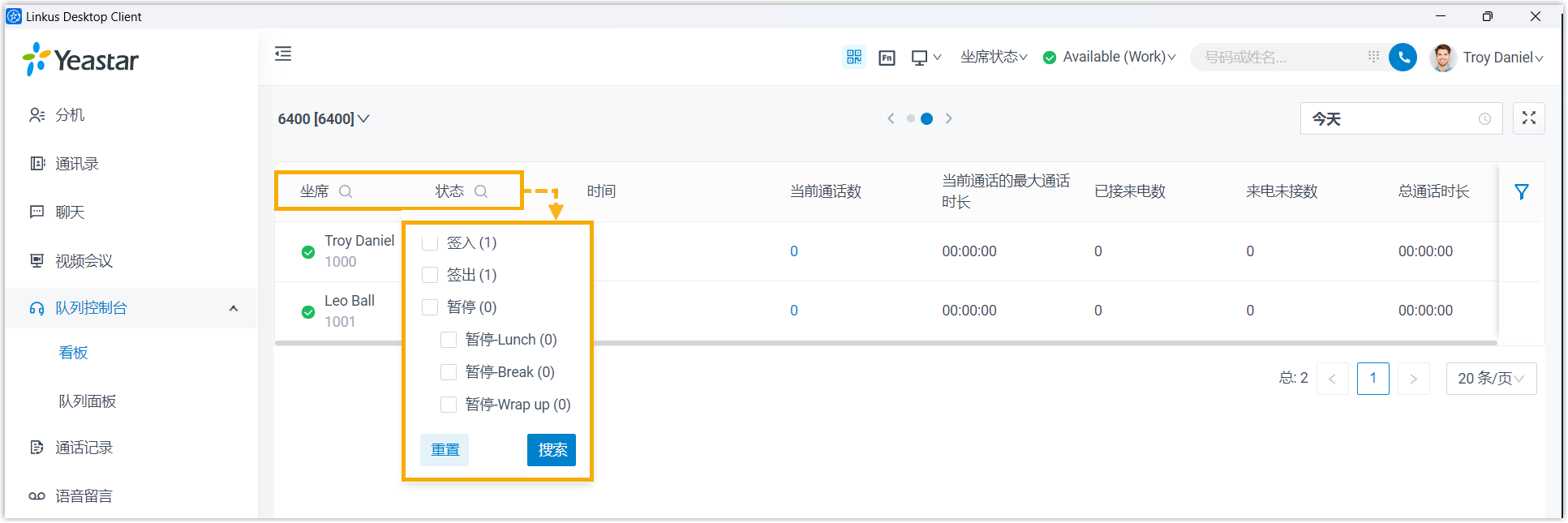 状态 列新增筛选器,便于直观查看各状态下的坐席数量。