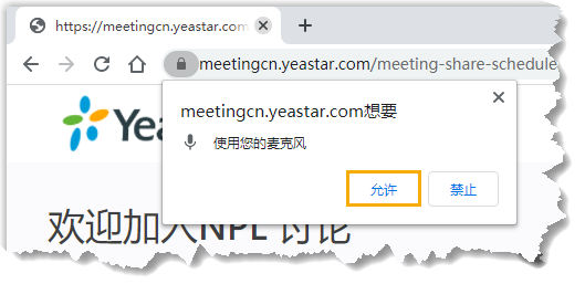meetingcn.yeastar.com请求使用麦克风。注: 如果没有出现弹窗,你可以点击地址栏的