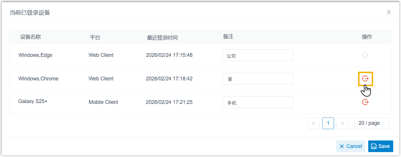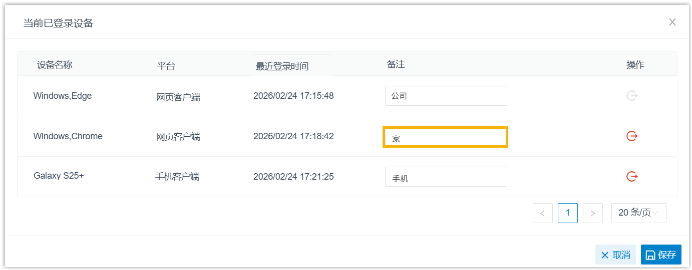 你可以在 Linkus 网页端查看登录分机的所有 Linkus 客户端及其相关的设备信息 (设备名称、客户端类型及最后登录时间)。此外,你还可以为设备添加备注,或将分机从指定设备上登出。