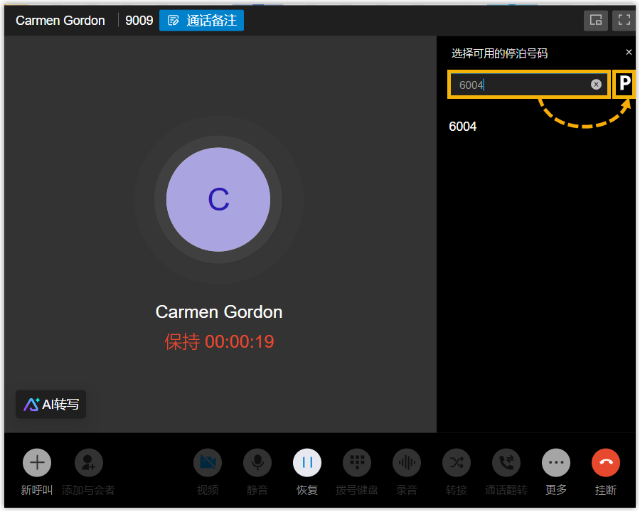 • 通话被停泊至指定的停泊号码,屏幕上弹出 “通话已被停泊在 6004。” 的提示。