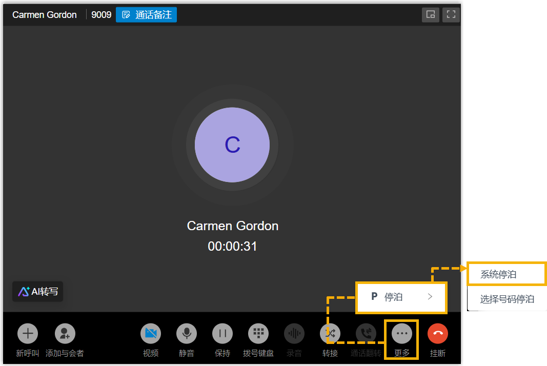 • 选择号码停泊:如果部门或个人拥有专属的停泊号码,你可以根据需要将通话停泊至指定的停泊号码