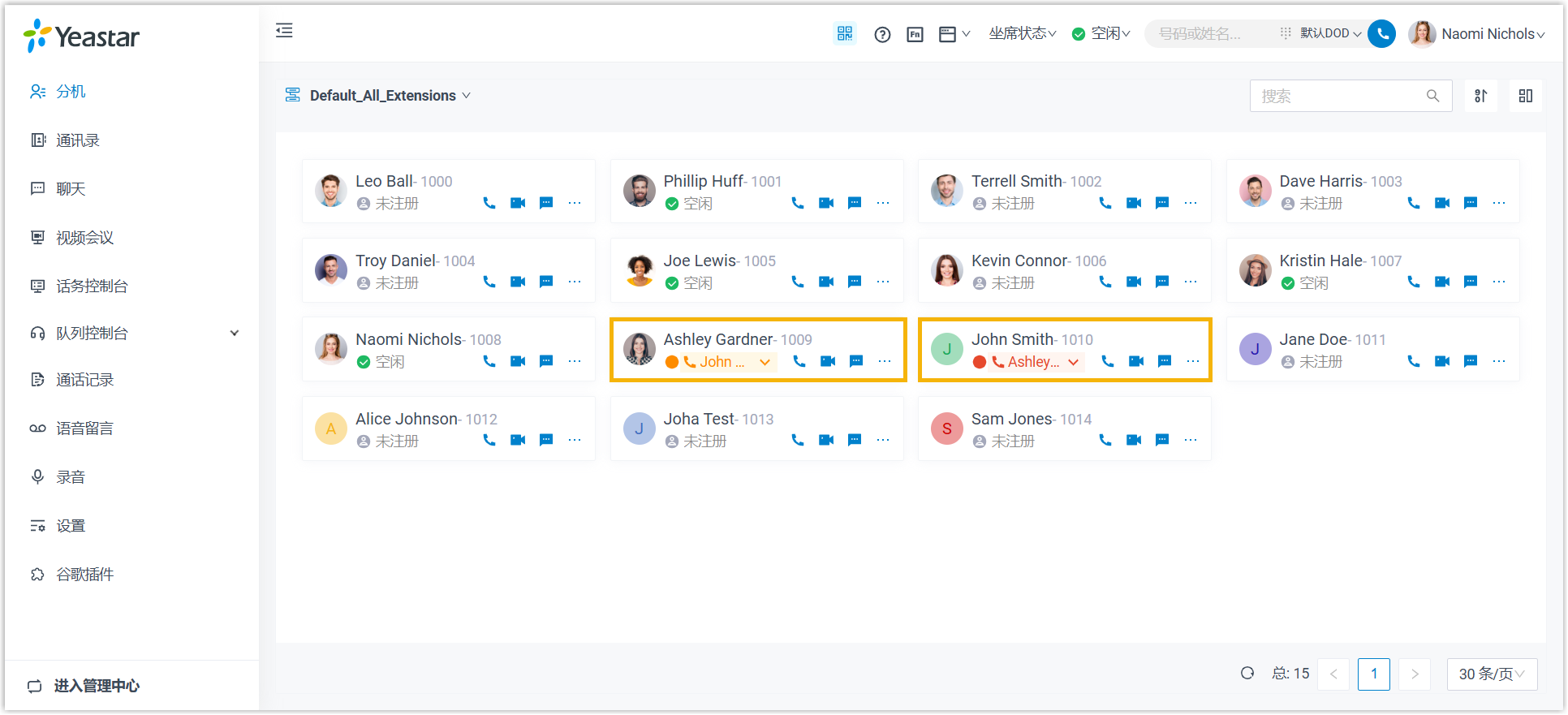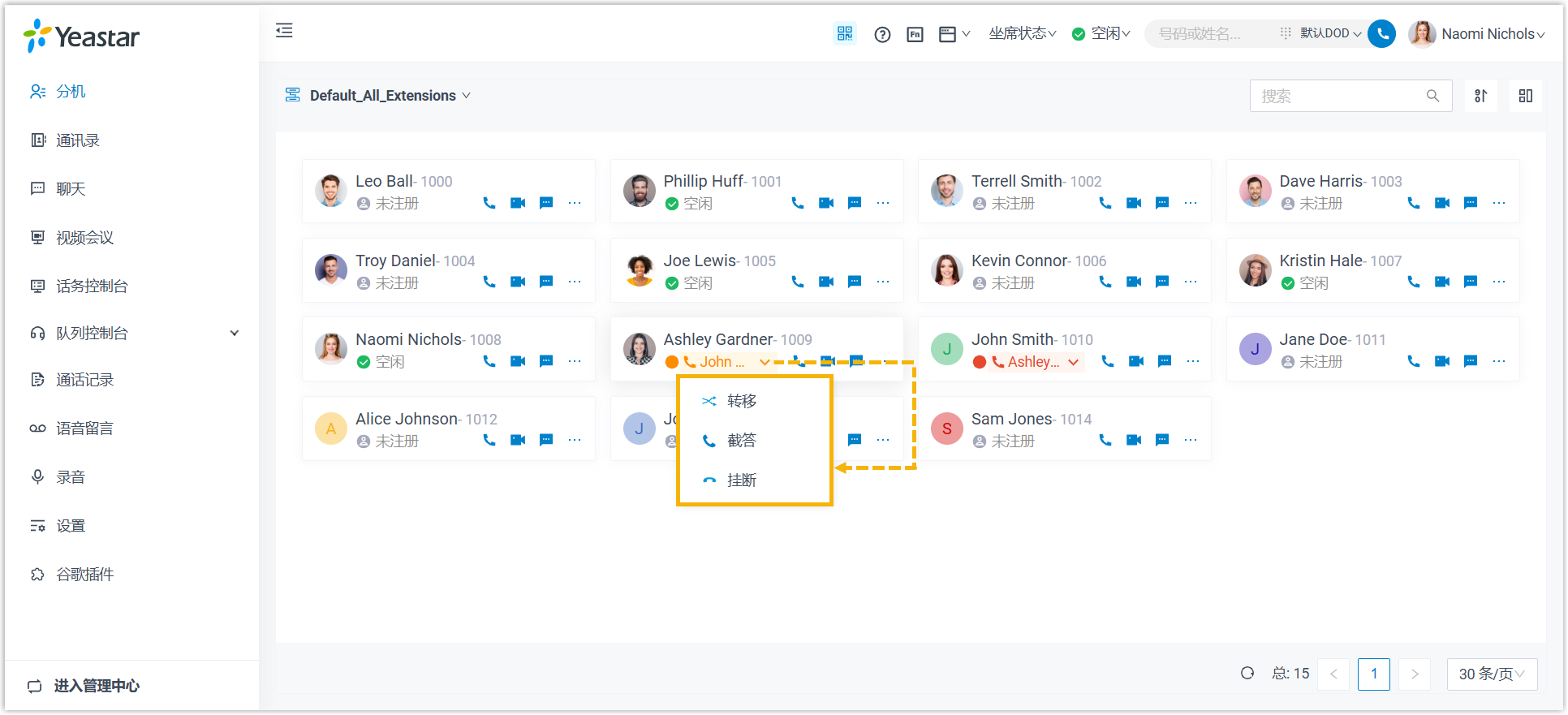 授权用户可以在分机页面中即时查看同事分机的响铃或通话状态、通话对象的姓名和号码,并轻松管理通话。本文介绍如何查看和管理同事分机的通话。