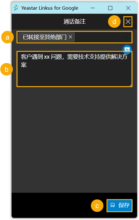 - 在 备注 字段,填写说明,以记录通话重要信息。