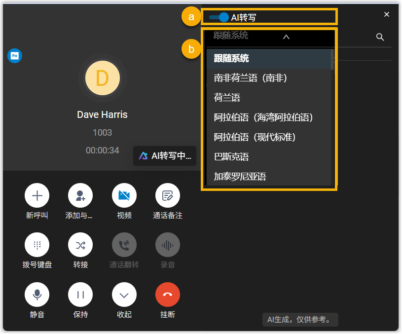 - 在通话过程中,点击 AI转写,打开转写面板。