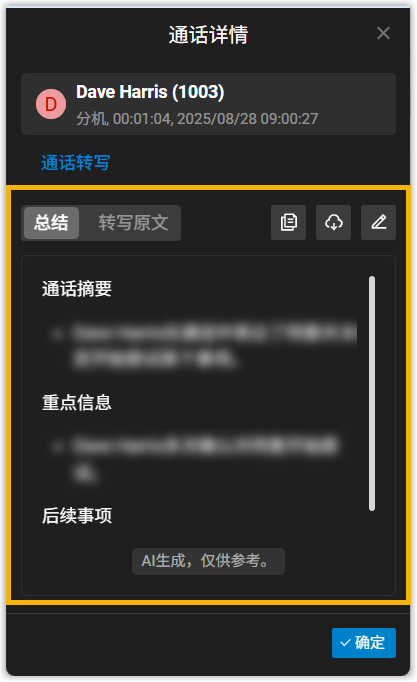 如果启用了 通话后展示转写内容,通话结束后,将自动展示本次通话由 AI 生成的总结与转写原文。
