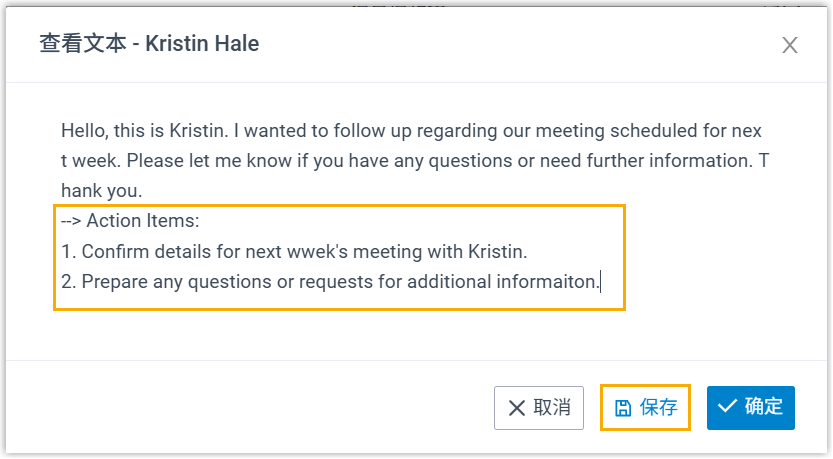查看或编辑转写的语音留言文本 注: 仅当管理员设置了语音留言转写功能时才支持查看文本。- 将鼠标悬浮在语音留言上。