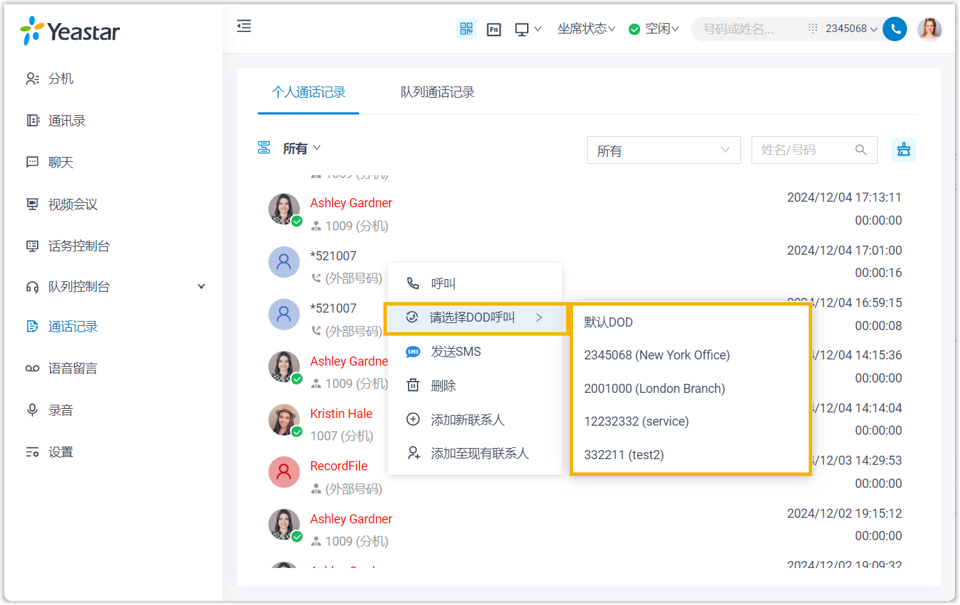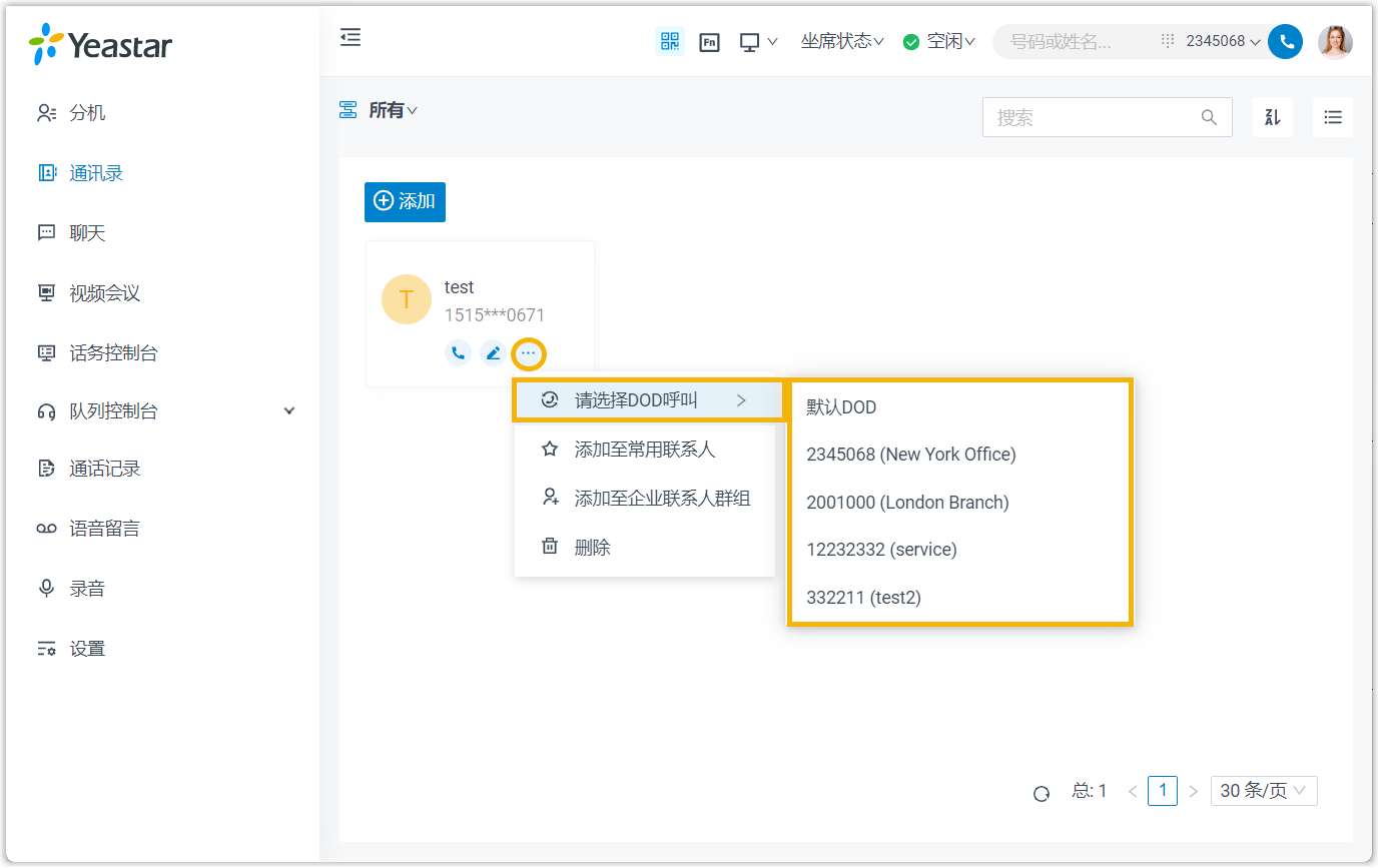 - 在右上角拨号盘的下拉列表中,选择要固定使用的 DOD 号码。