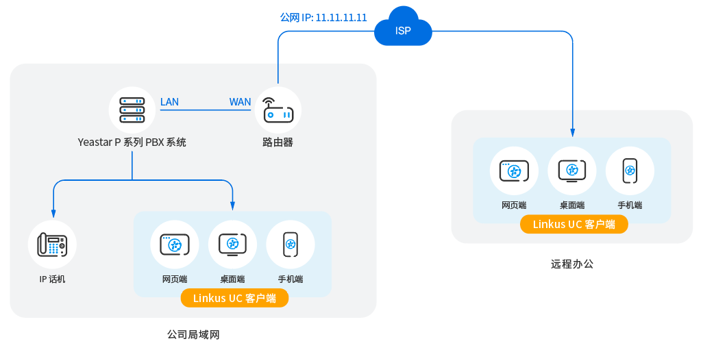 - Linkus 本地服务器和远程服务器都已配置成功。注: 用户在公司局域网中使用 Linkus 时,Linkus 通过本地 IP 地址通信。否则,Linkus 通过远程 IP 地址通信。