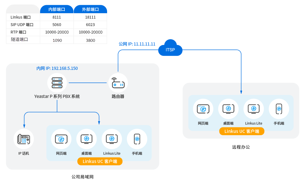 - 基于以上网络拓扑,你可以根据如下说明配置 Linkus 服务器和路由器: