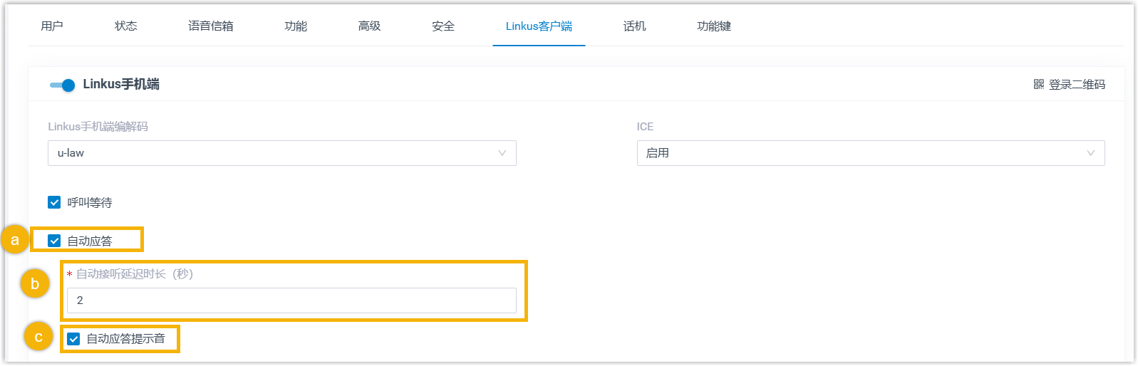 自动应答功能用于自动接听非广播组来电或广播组来电,无需手动点击接听,从而大大减少了呼叫者的等待时间。你可以为用户的 Linkus 手机端、桌面端或网页端单独启用自动应答,配置将同步至其 Linkus UC 客户端。