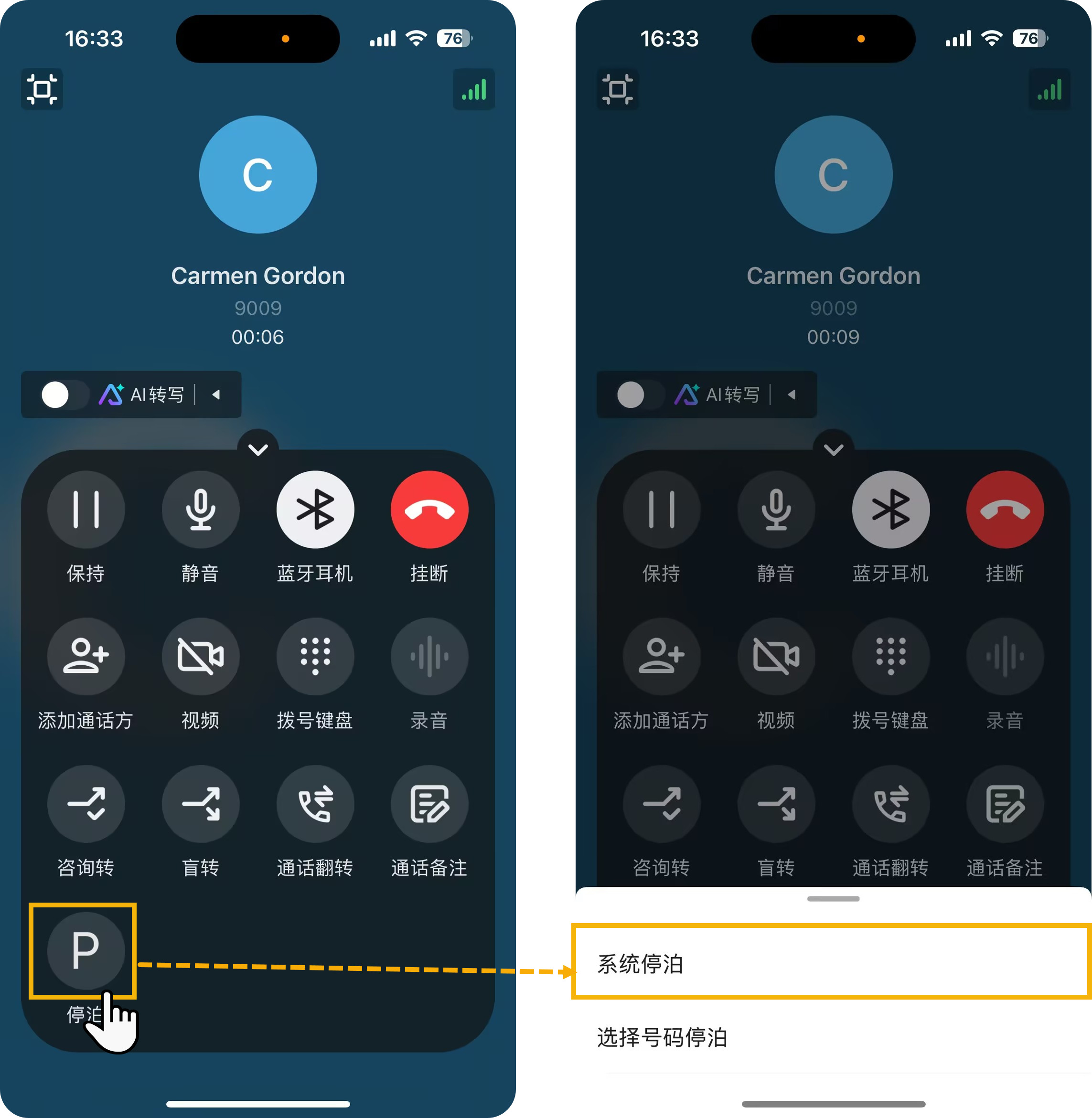 在通话过程中,你可以直接点击通话屏幕上的按键,将通话停泊至系统分配或手动选择的停泊号码。
