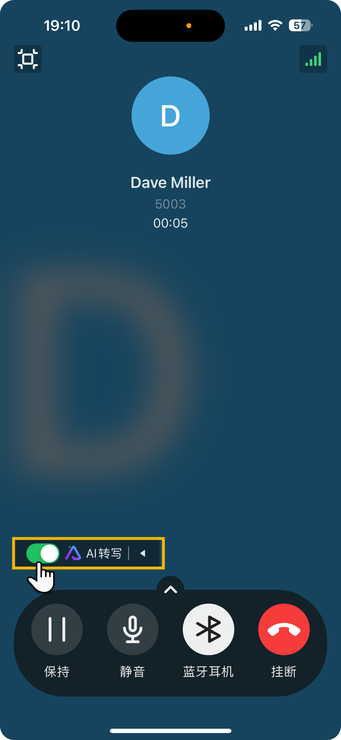 - 在通话过程中,在通话界面上打开 AI转写 的开关。