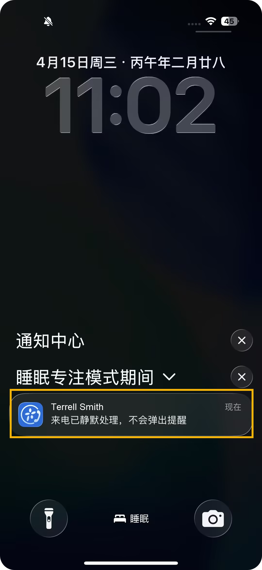 来电将以静默通知形式显示在通知中心,以进行提醒。