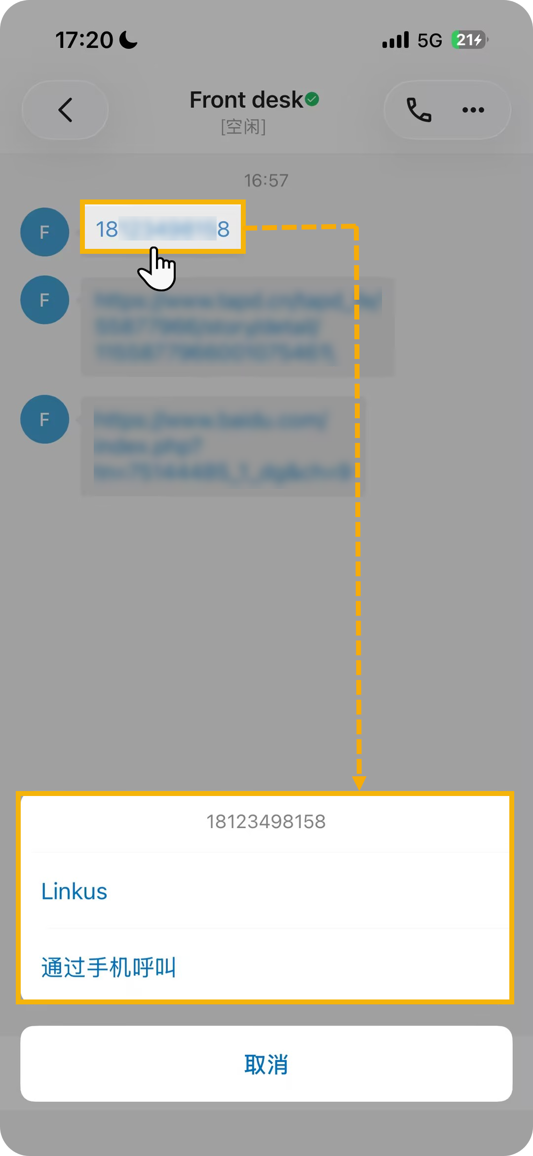 - 如果文本消息被识别为电话号码,点击该号码将弹出两种通话选项 ( Linkus 和