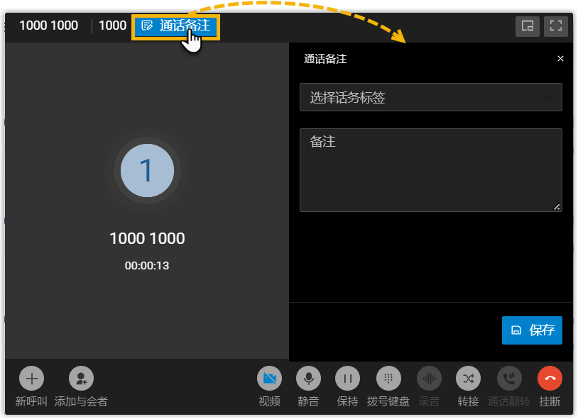 功能,支持在通话过程中添加备注,通话结束后也可在对应通话记录中查看或编辑备注,便于记录重要信息以供后续参考。注: 此功能仅在系统管理员启用 通话备注 时可用。