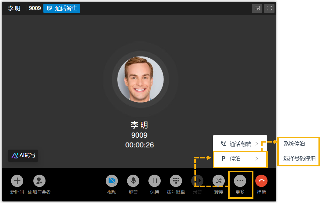 在通话过程中,你可以在通话窗口中点击 停泊 按键,将通话停泊至系统自动分配的停泊号码或手动选择的停泊号码。注: 要实现此功能,系统管理员需将 PBX 升级到 83.21.0.66 或更高版本。