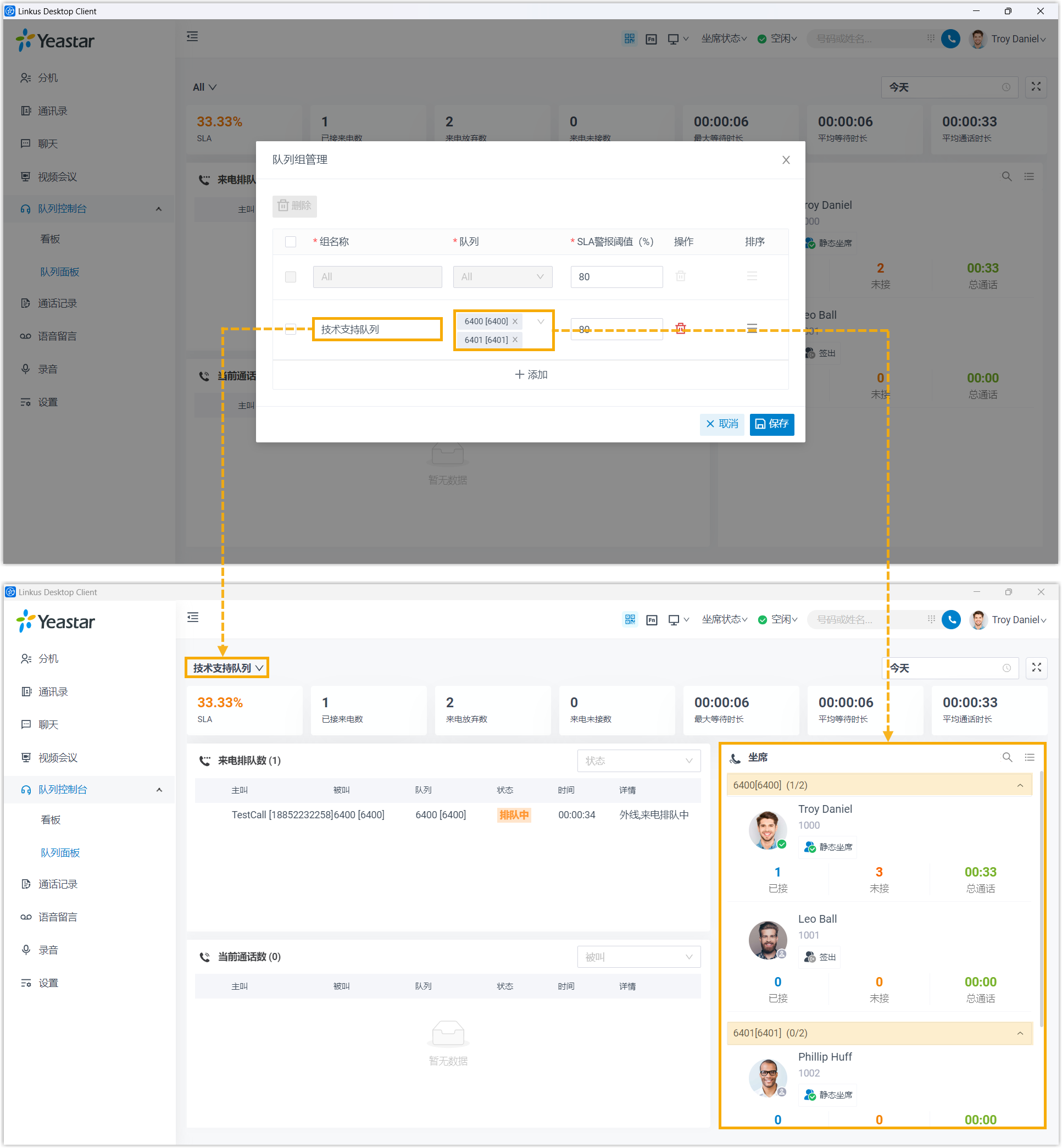 中集中监控多个队列的数据和通话。你可以通过创建组,自定义要同时显示的队列。