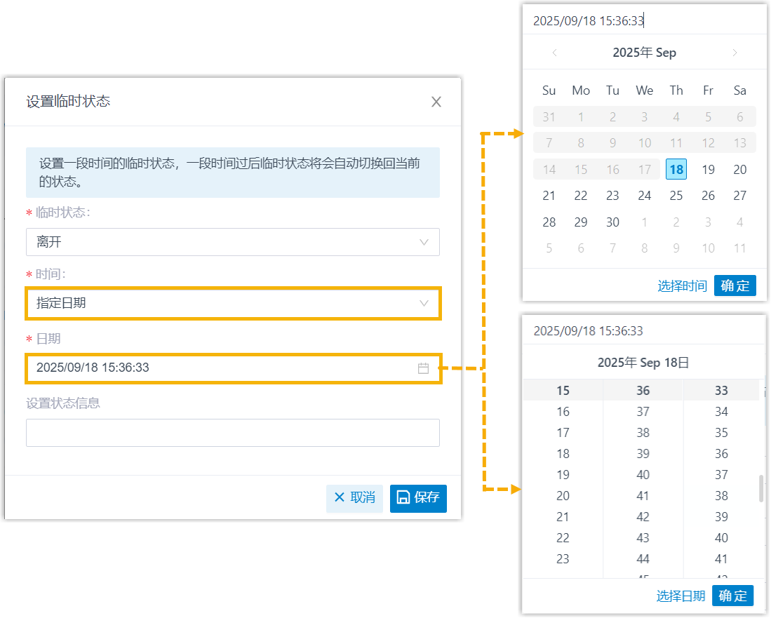 优化 设置临时状态 功能:支持为临时状态设置具体的结束日期和时间。一旦到达指定时间,临时状态将自动恢复为原本的状态。