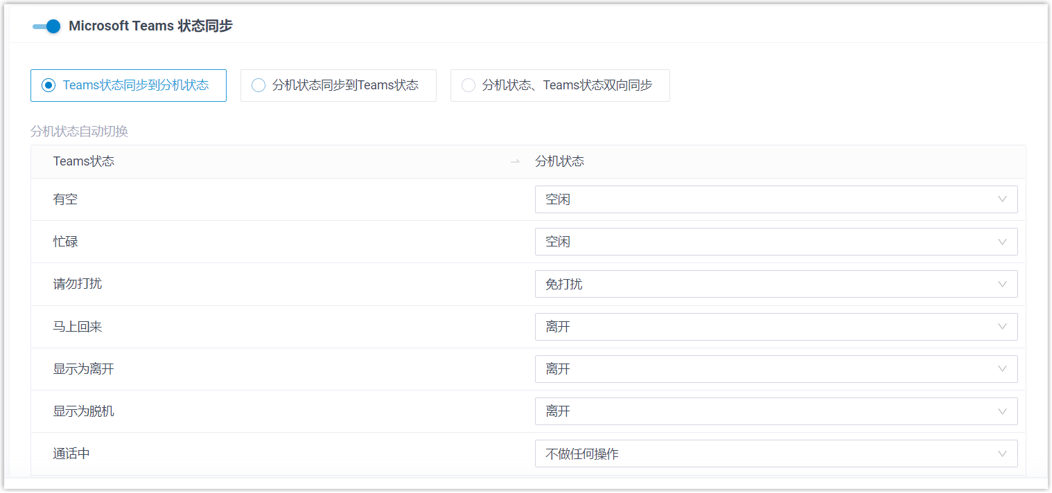 - 优化 Microsoft Teams 状态同步 功能 (路径:),允许你自行决定分机与 Microsoft Teams 之间的状态同步方向。注: 该功能仅在系统管理员对接了 PBX 服务器和 Microsoft 365,并为你的分机启用了 Microsoft Teams 状态同步 后可用。