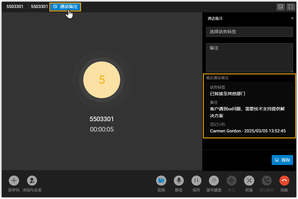 - 若通话被转接,下一个用户在应答后可见最近的通话备注