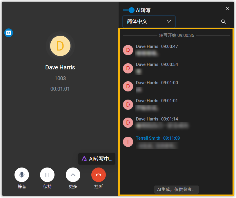- 在通话过程中,点击 AI转写,打开转写面板。