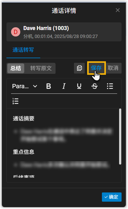 如果启用了 通话后展示转写内容,通话结束后,将自动展示本次通话由 AI 生成的总结与转写原文。