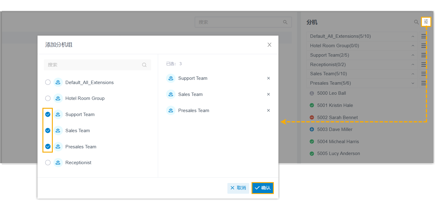 分机 区域按分机组或部门展示分机信息及其实时状态,帮助你快速了解分机用户的工作状态。