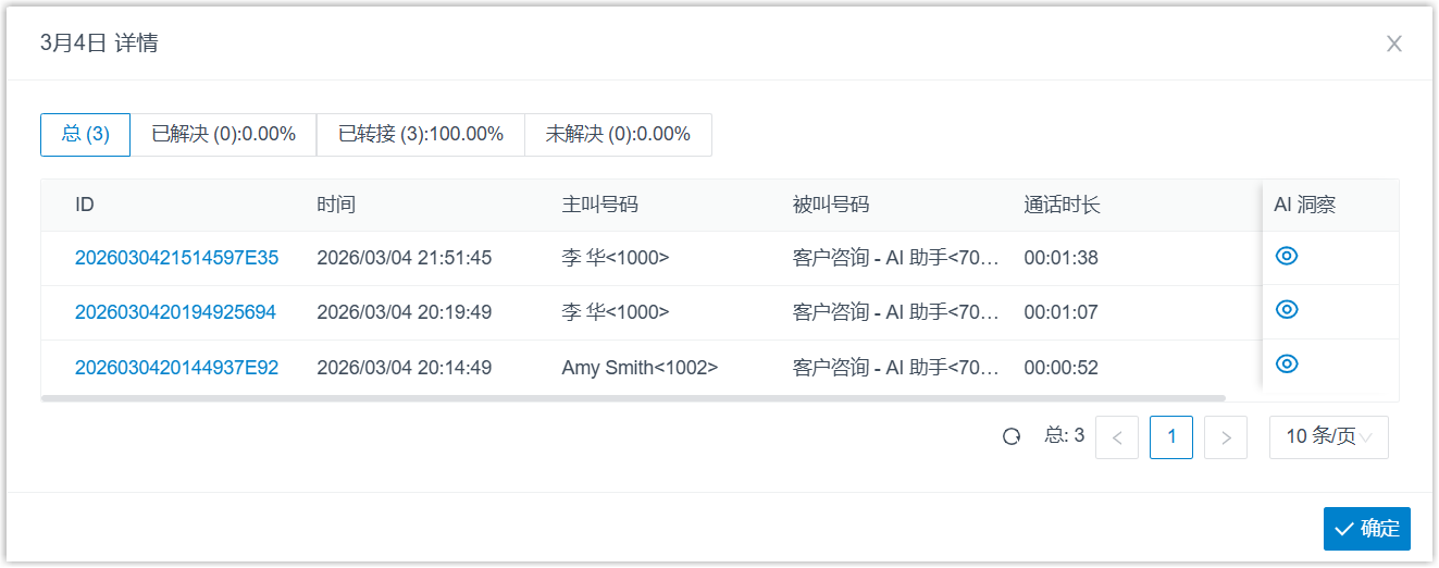 参考下表了解 AI 接待员处理的每通电话的详细信息。