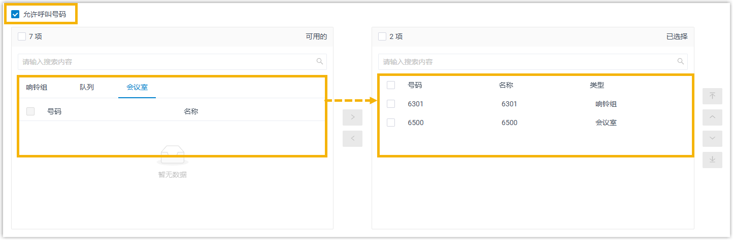 - 勾选 允许呼叫号码,然后将所需的响铃组、队列或会议室 从