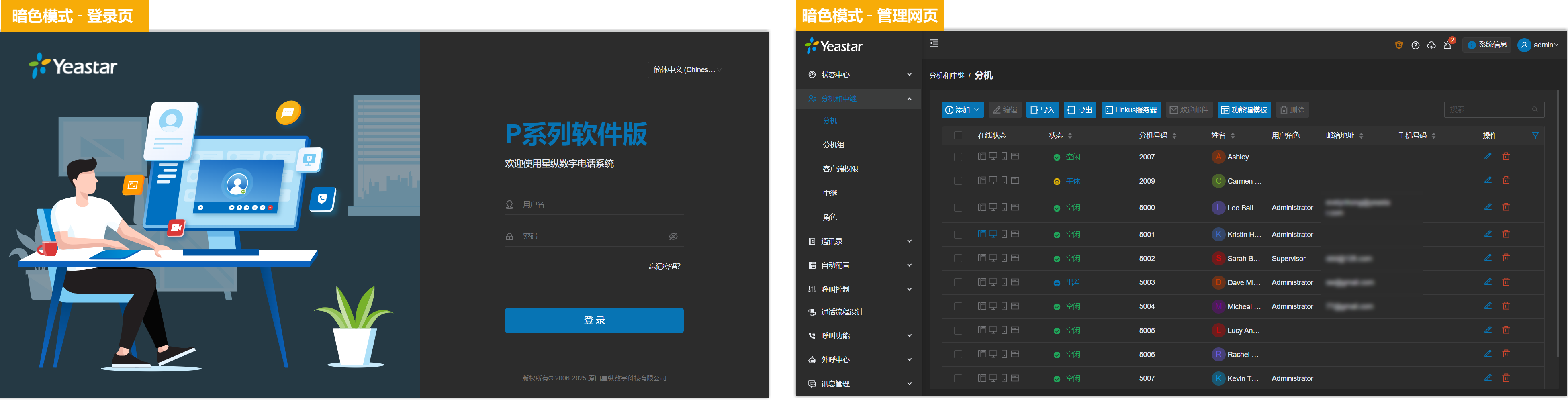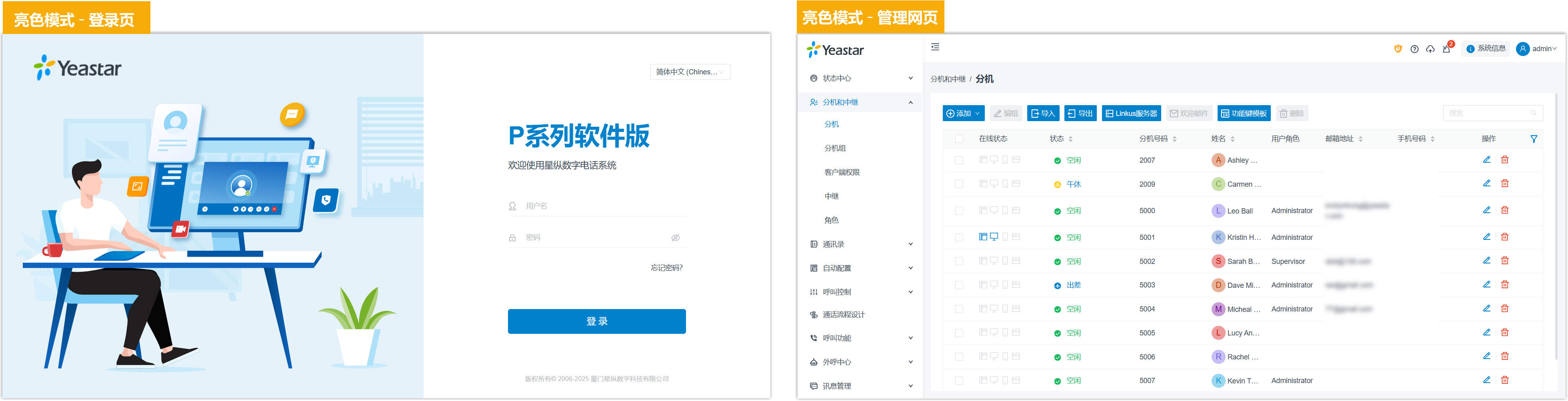 默认情况下,PBX 网页界面会自动匹配你的浏览器的主题设置,在亮色和暗色主题之间相应切换。你也可以手动将 PBX 设置为使用固定的亮色或暗色主题,而忽略浏览器的设置。
