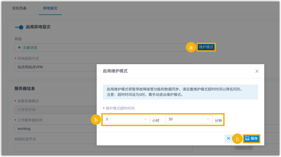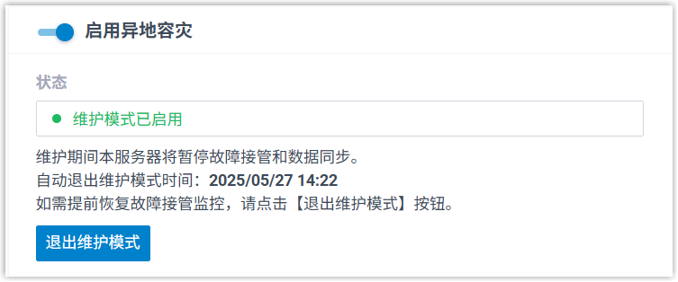 - 状态显示 维护模式已启用,在此期间灾备服务器将暂停通话业务接管监控和数据同步。