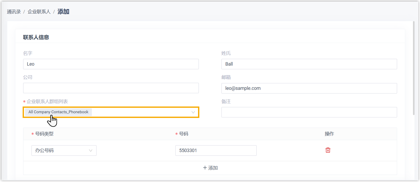 - 填写联系人信息。注: 如果 PBX 订阅了 通讯录专业版,此联系人会自动添加到默认的企业联系人群组 All Company Contacts_Phonebook。如需将此联系人添加到其他群组中,你可以从 企业联系人群组列表 中选择其他群组。