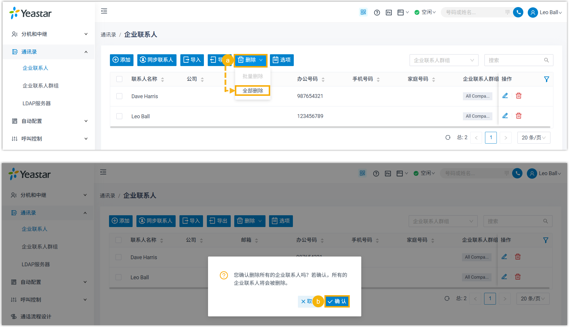 - 删除全部联系人,点击 删除 并选择 全部删除,接着点击
