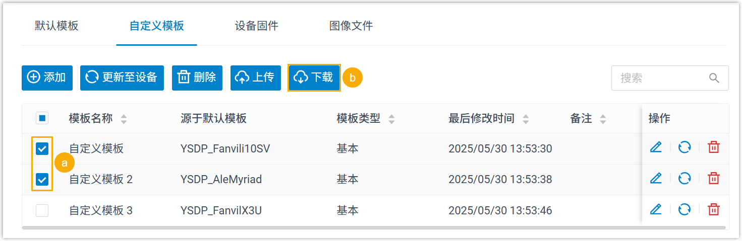 。 - 更新多个模板应用的设备,勾选相应的模板,点击 更新至设备。