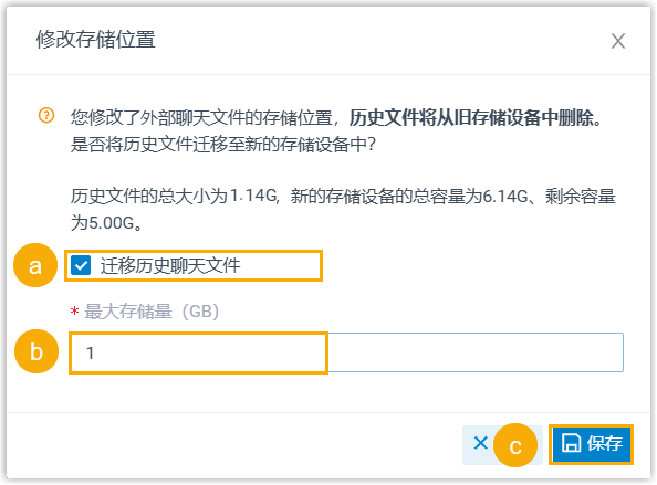 - 要将历史聊天文件迁移到新的存储位置,勾选 迁移历史聊天文件。重要: 无论历史聊天文件是否迁移,更改存储位置后,文件都会从原存储设备中删除。
