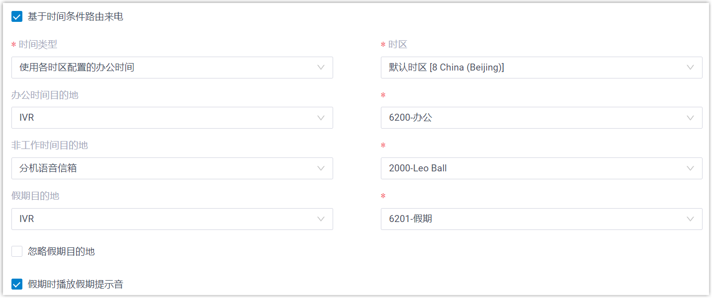 本例中,系统先向假期来电的客户播放提示音 "office_holiday",再将通话路由到假期目的地。