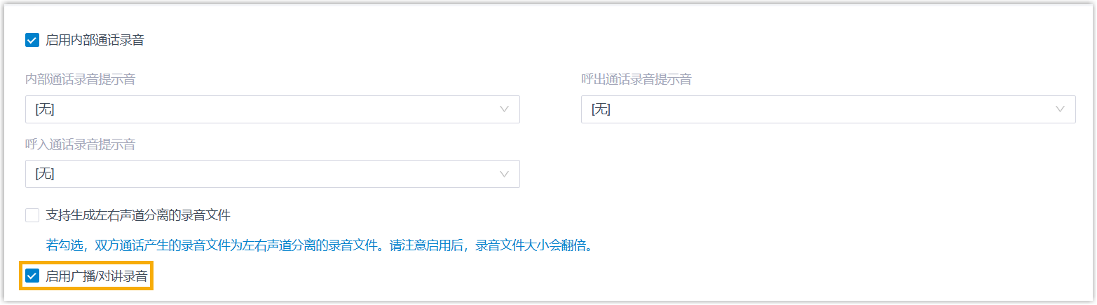 本文介绍如何为分机、中继、广播/对讲、会议室、队列和 IVR 设置通话录音。