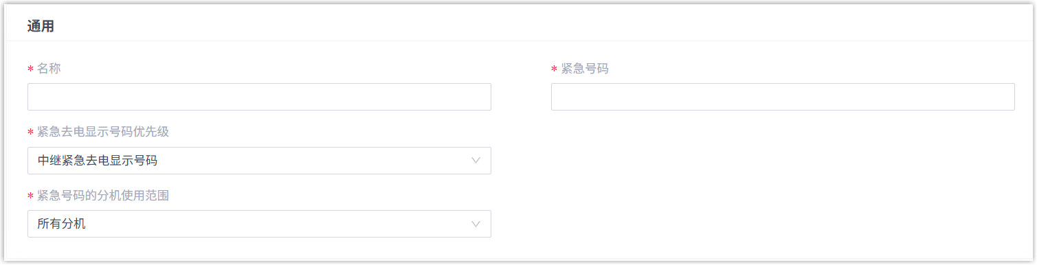 设置 说明 名称 填写名称帮助你识别该紧急号码。 紧急号码 填写紧急号码。 紧急去电显示号码优先级 选择拨打紧急号码时的显示号码取值顺序。 - 中继紧急去电显示号码:如果你要为所有分机用户设置通用的 ELIN,请选择此项。 无论哪个用户拨打紧急电话,PSAP 都会接收到 中继紧急去电显示号码,这表示 PSAP 接收到的位置信息是一样的。