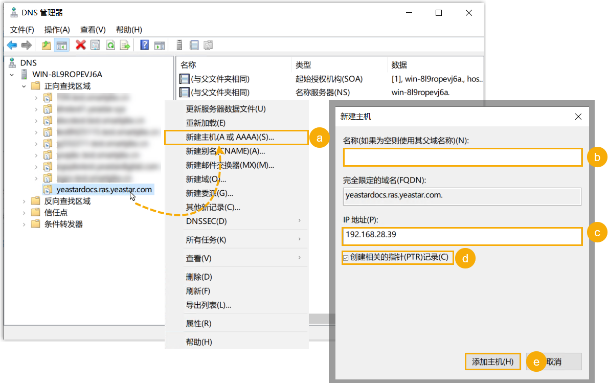 - 右键点击上一步中添加的域名,然后选择在 新建主机(A 或 AAAA)(S)...。